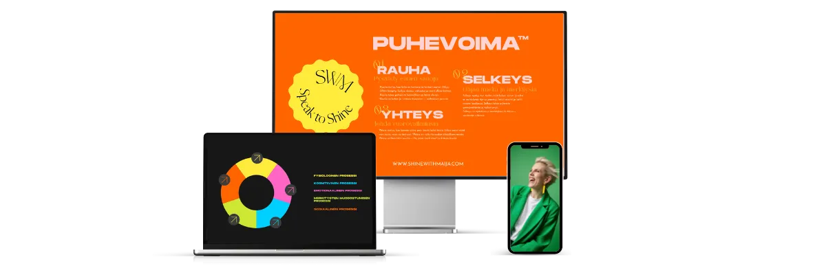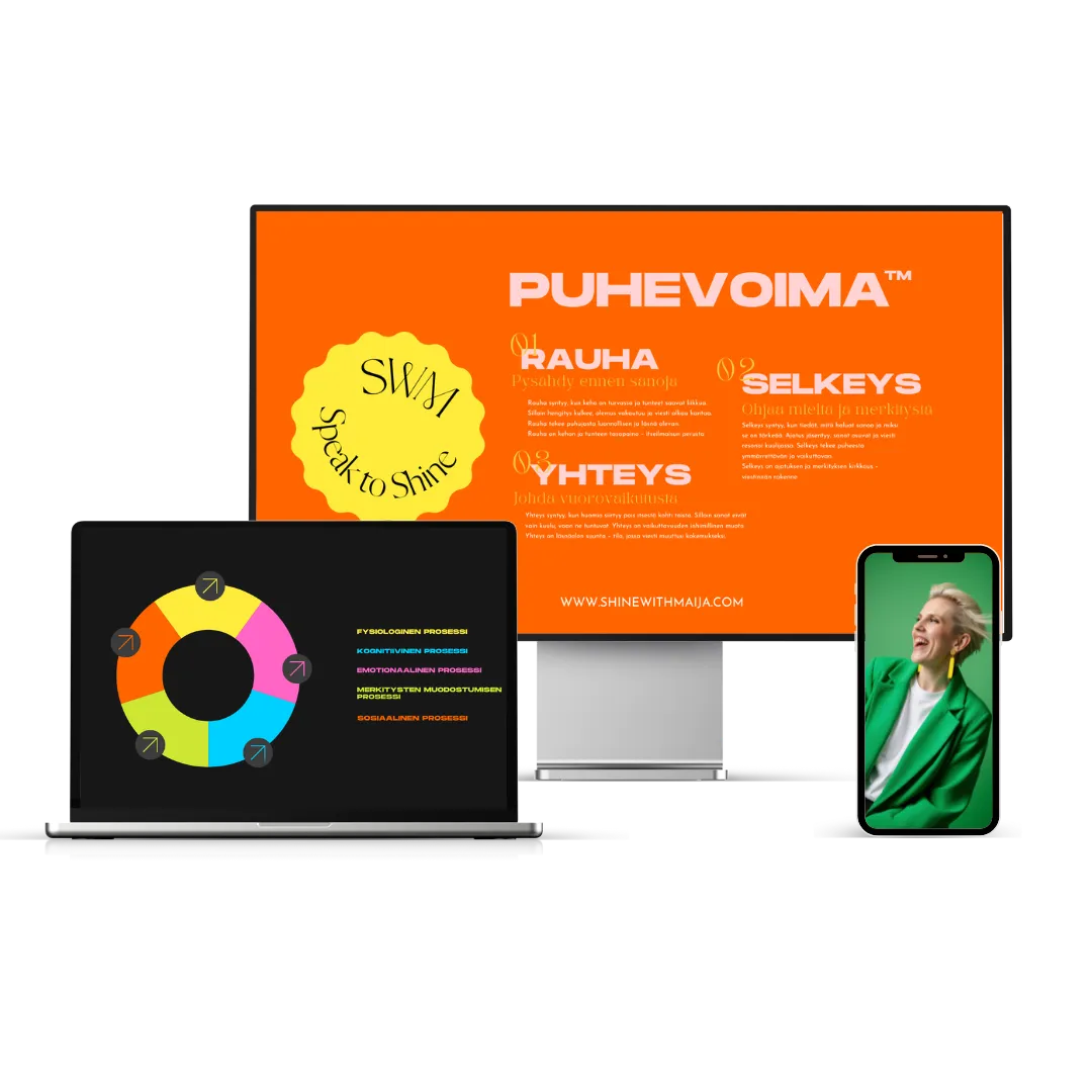 Speak to Shine™ on askel askeleelta etenevä valmennusohjelma, joka rakentaa puhumisen taidon niin, että sisäinen tila, ajattelu ja vuorovaikutus alkavat toimia yhdessä — vakaasti, selkeästi ja luonnollisesti, ilman turhaa ponnistelua ja puristusta.